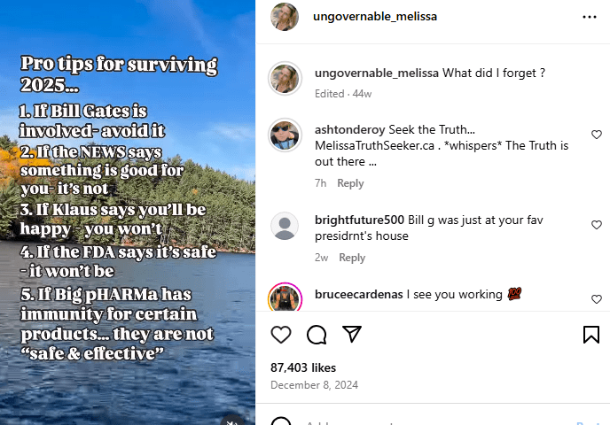 Is it Truth Melissa wants? Or a disease outbreak? Mass suffering in her community? Maybe she even wants death! What is the limit to her limitless stupidity and misinformation? The point in this matter is… What gives her a right to be a voice on Vaccines?! She is an idiot Instagram creator and a probable future divorcee. Can’t see anyone that stupid making it work….